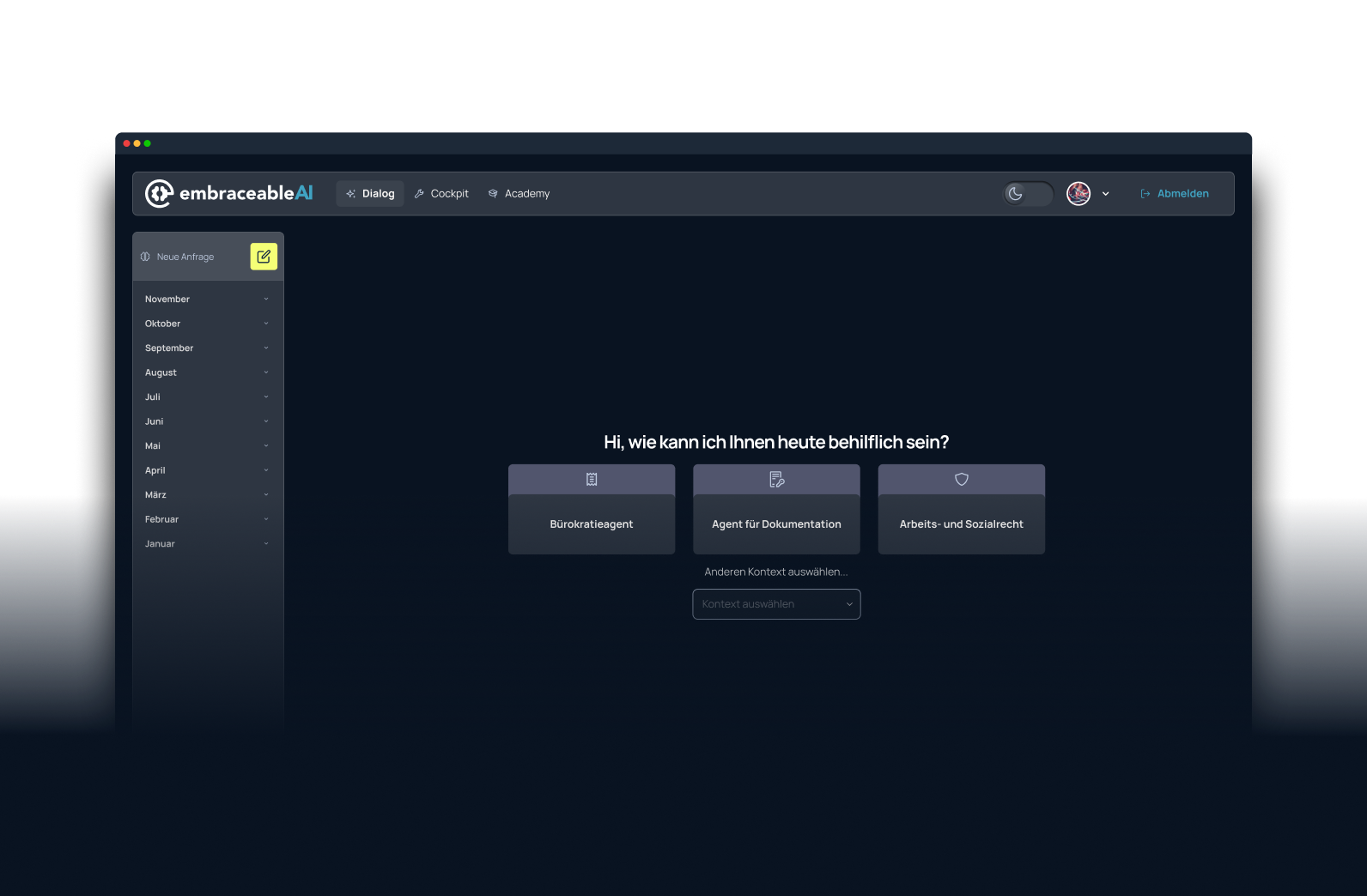 „Wir möchten das volle Potenzial Generativer KI nutzen, ohne auf Datenschutz und volle Daten-Souveränität zu verzichten. Die embraceableAI Plattform ermöglicht uns dies und bietet zudem eine agnostische Austauschbarkeit von LLMs sowie eine effektive Skalierung für KI-Applikationen.“